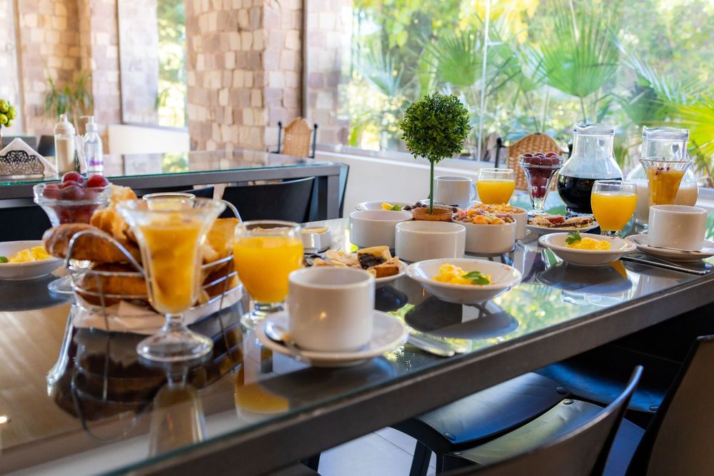 It's a country-style breakfast full of delicious things to try: a variety of teas and coffees, hot chocolate, yogurt with sugar, and different types of cereal. Fresh bread every day: croissants, shaved ice, and toasted country bread for spreading butter, homemade jams, and cream cheese. A variety of seasonal fruits, fruit salad, flavored fruit water, and freshly squeezed orange juice. We also have keto options: scrambled eggs and ham and cheese rolls. There's also an option with Oreo cookies and Pepitos for the little ones. And there's always a house specialty...